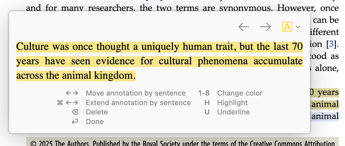 An “Annotate Sentence” button — or H or U on your keyboard — will automatically highlight or underline the last sentence you heard, and you can use shortcut keys to quickly move, expand, or delete the new annotation.