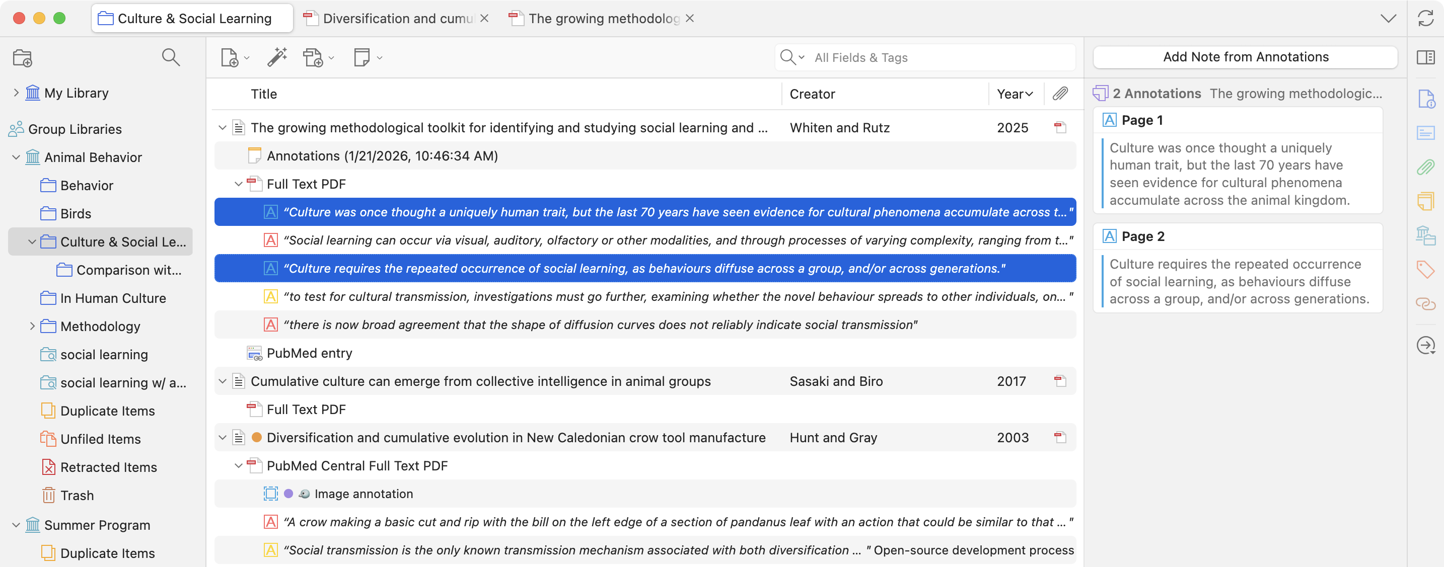 Showing annotations in the items list makes it easier to view annotations across a library or collection, and it also makes it possible to search for annotations directly. For example, you can search for all annotations in a collection with a given tag and then create a note from those annotations or copy them to an external text editor with Quick Copy.