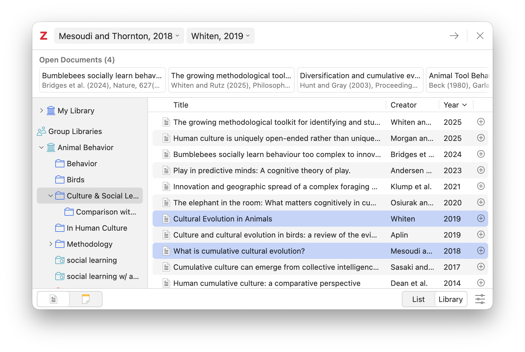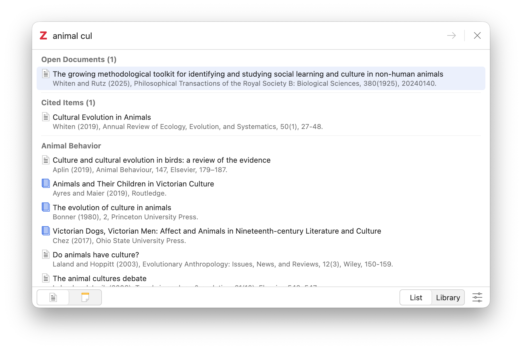 The new dialog has two modes: List mode and Library mode. List mode lets you quickly search for citations from across your Zotero libraries by title, creator, and year. Library mode includes a library browser, letting you find items in specific libraries or collections. You can switch between the two modes with a single click, preserving any added items or entered search terms. By default, it will open in the last mode you used, but you can choose a different default mode in the settings.